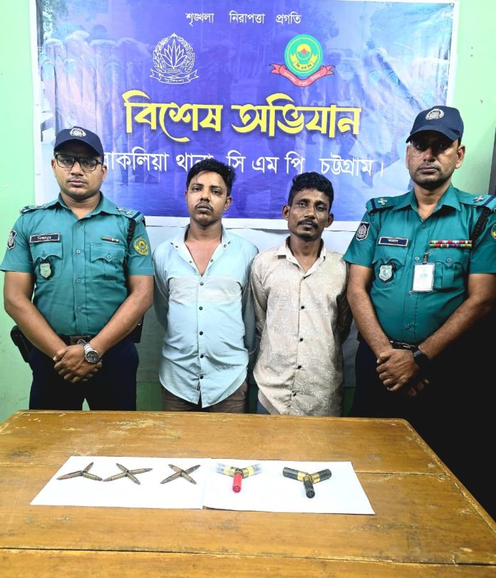 চট্টগ্রাম নগরের বাকলিয়ায় সিএমপি পুলিশের বিশেষ অভিযানে দুই সন্ত্রাসীকে গ্রেপ্তার করা হয়েছে। এসময় তাদের হেফাজত থেকে উদ্ধার করা হয়- এসএমজির ১১ রাউন্ড তাজা গুলি ও শটগানের ৬ রাউন্ড কার্তুজ।